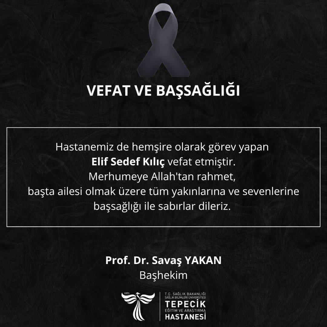 İzmir Tepecik Eğitim ve Araştırma Hastanesi Başhekimi Prof.Dr. Savaş Yakan, vefatın ardından yaptığı açıklamada, “Hastanemiz de hemşire olarak görev yapan Elif Sedef Kılıç vefat etmiştir. Merhumeye Allah’tan rahmet, başta ailesi olmak üzere tüm yakınlarına ve sevenlerine başsağlığı ile sabırlar dileriz” dedi.